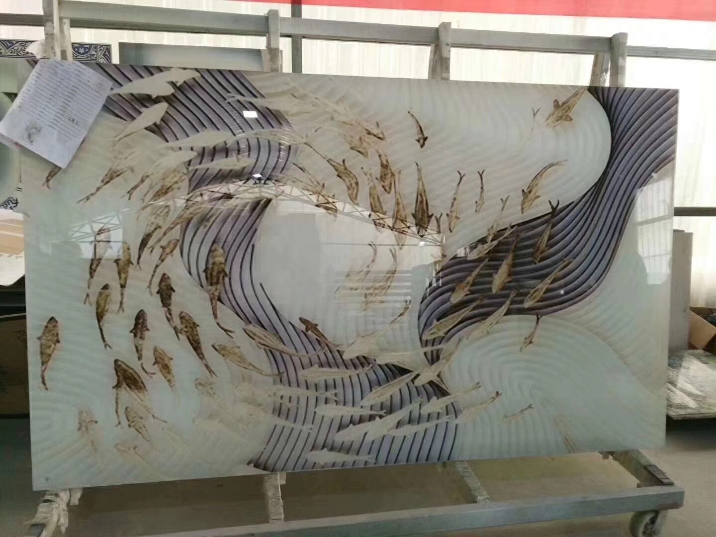 首先在玻璃店,訂好跟您的瓷磚相同大小的鋼化玻璃(3mm厚的就夠了),接下來用UV打印機在鋼化玻璃上彩印圖案,然后在玻璃上上一層特殊材料,用夾膠機夾合他們(讓他們復(fù)合在一起),這樣就成了(此工藝一般運用在地板磚上,微晶復(fù)合做背景墻,不如直接做玻璃背景墻的省成本)。
