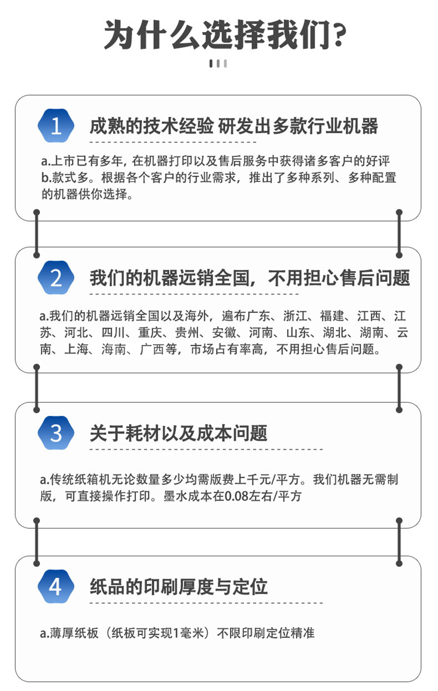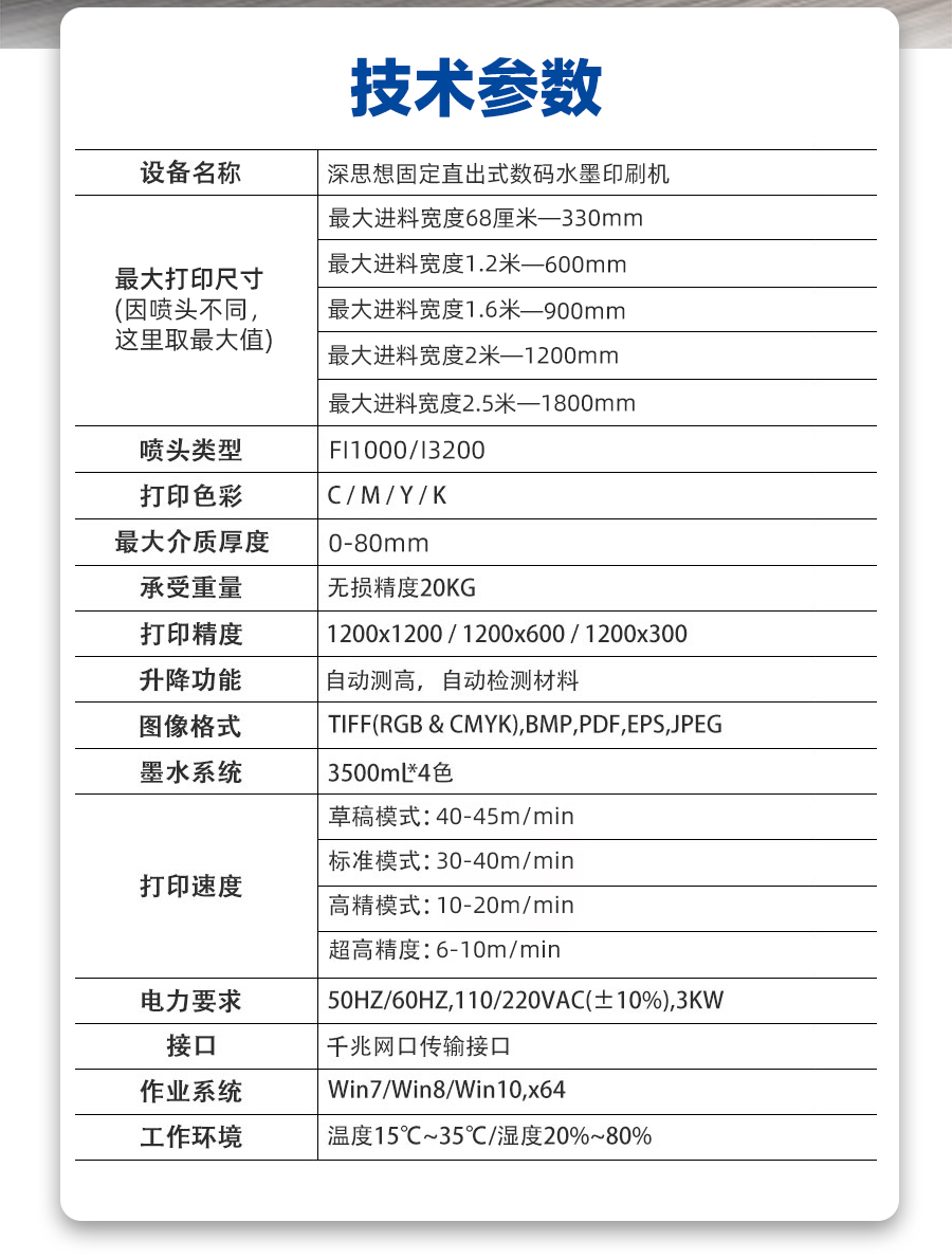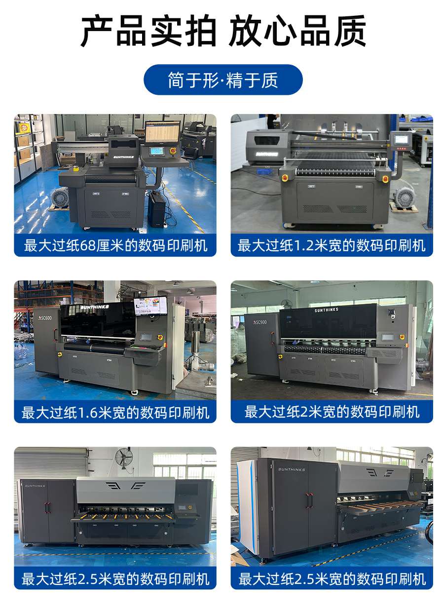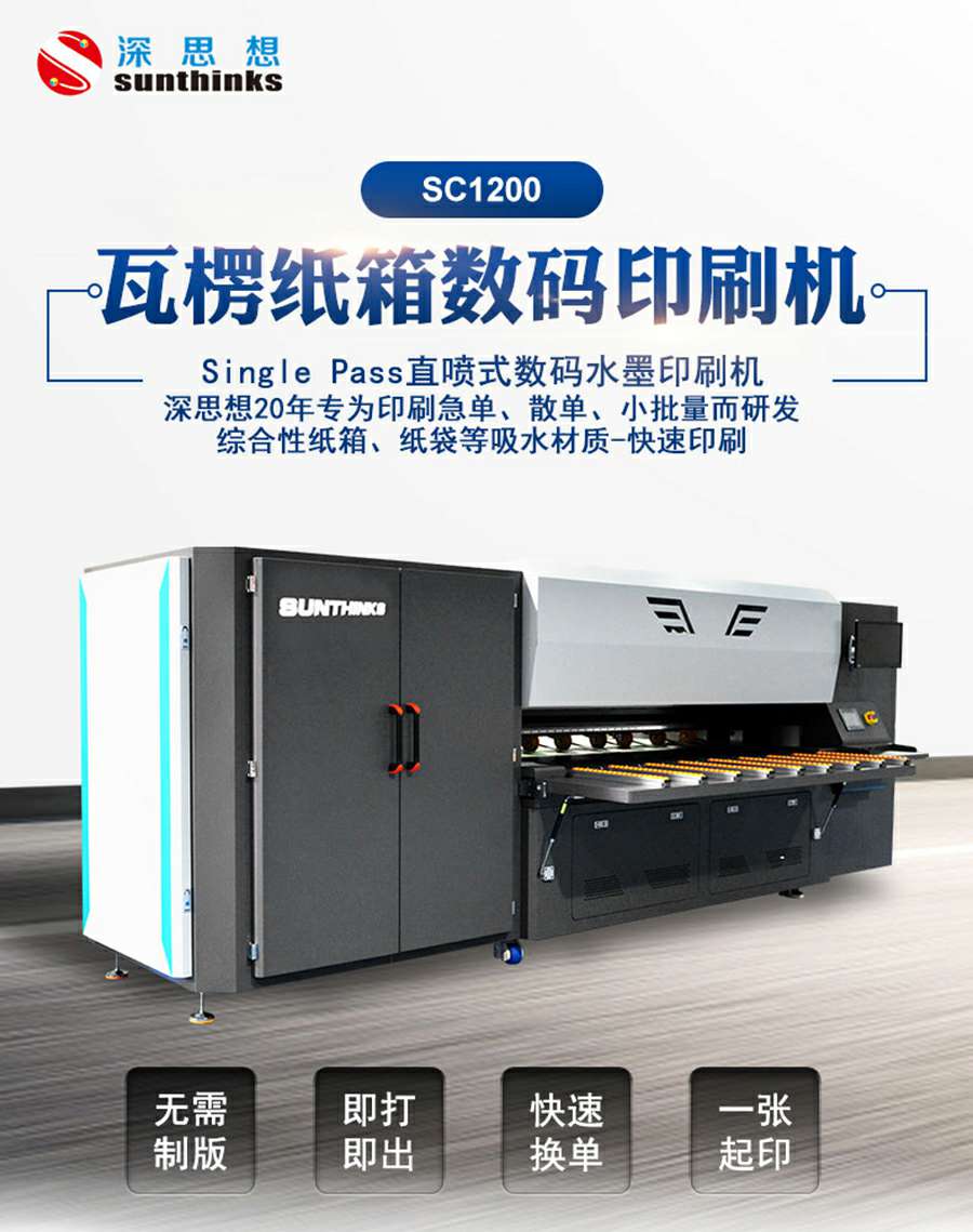 Single pass數(shù)碼水墨印刷機(jī) 賣點(diǎn): 1、原廠授權(quán)進(jìn)口噴頭,無需制版,1鍵打印,立打立取,省時(shí)省力,節(jié)省人工和制版等多項(xiàng)工藝費(fèi)用。 2、單色、多色、漸變色均可一次輕松搞定,色澤艷麗,圖案逼真;不偏移、不錯(cuò)位,精度高達(dá)1200dpi,速度高達(dá)0.8米/秒。 3、獨(dú)有的獲得研發(fā)專利的墨路循環(huán)方案,保證siglepass直出式數(shù)碼印刷機(jī)長期打印的穩(wěn)定性。 4、支持多任務(wù)印刷,可在線快速換單,支持可變數(shù)據(jù)二維碼打印,支持卷對(duì)卷打印,連續(xù)穩(wěn)定流水線式印刷。應(yīng)用靈活、急單、短單(小批量)不再困擾,真正做到1張起印。 5、single pass單程模式打印,機(jī)頭固定,無需左右掃描,更省墨水,速度更快。噴頭型號(hào)可供選擇,整體配置性價(jià)高, 6、定位精準(zhǔn):紅外光電感應(yīng)定位,精準(zhǔn)檢測進(jìn)料位置。送料機(jī)械擋板寬度可調(diào),通過皮帶自動(dòng)糾偏系統(tǒng),保證精準(zhǔn)送入打印位置。 7、綠色環(huán)保,無需洗機(jī),不用擔(dān)心產(chǎn)生額外廢水。 |