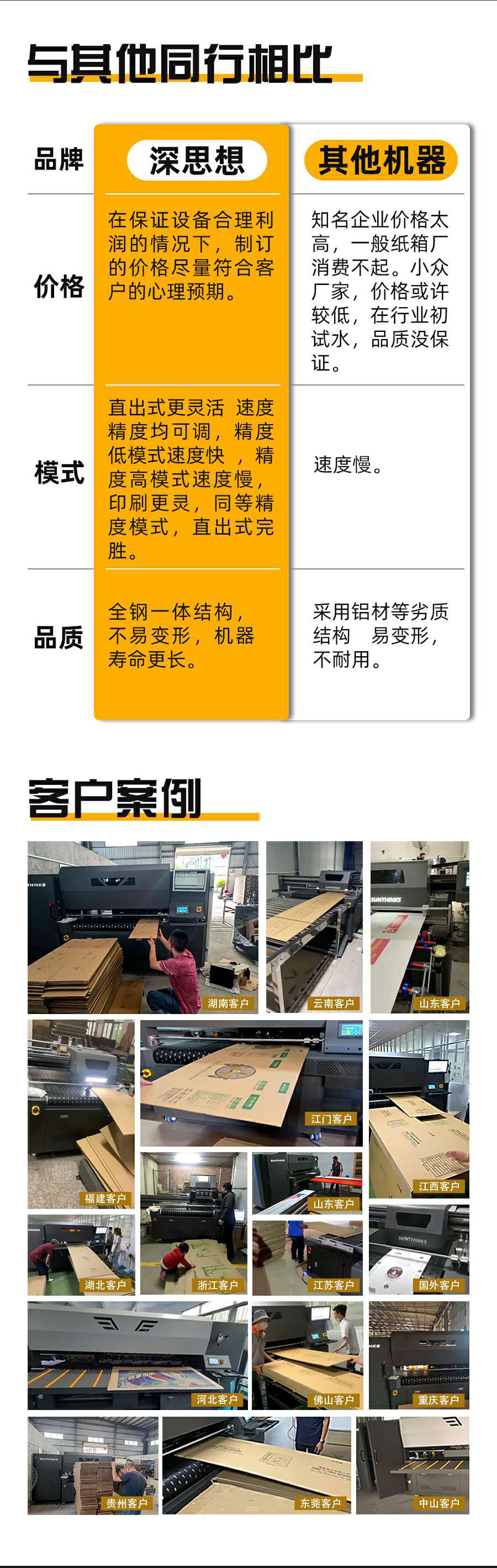 深思想數(shù)碼印刷機SC1200 賣點: 1、機器壽命長:精選配件,穩(wěn)定耐用。噴頭打印寬幅大,1顆打印30cm,得到了惠普原廠授權(quán),板卡自主研發(fā),獲多項專利技術(shù)保護。 2、無需制版,1鍵打印,千兆網(wǎng)卡,快速換版,立打立取,節(jié)省人工和制版等工藝費用 3、色彩豐富:單色、多色(非4種顏色)、漸變色均可一次搞定,圖案逼真;