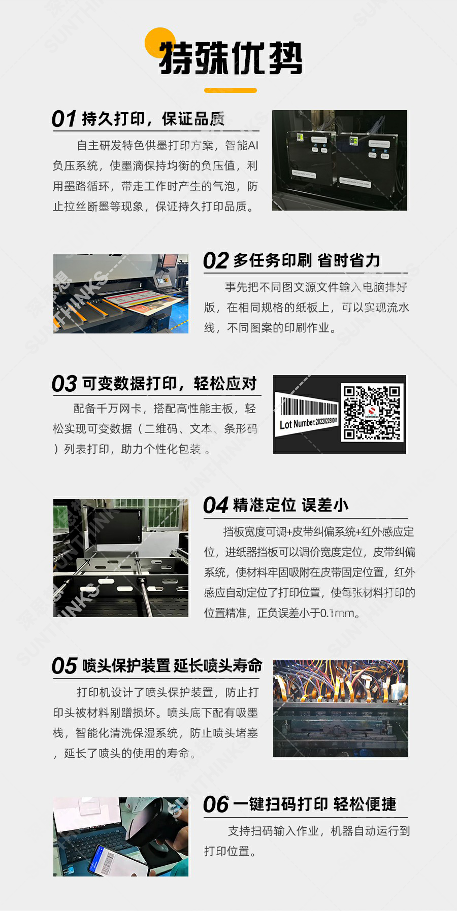 愛普生系列最大進料2米數(shù)碼水墨印刷機 賣點: 1、設備采用愛普生授權原裝打印頭,可實現(xiàn)可變墨點,4級灰度打印,彩圖色塊打印更加細膩。 2、可實現(xiàn)多任務印刷,無需制版,掃碼一鍵換單自動打印,自動化能力更強,省心更省力。 3、可變數(shù)據(jù)(靜態(tài)文本、條形碼、二維碼)打印,一物一碼,為管理提高安全性和效率,為營銷實現(xiàn)超級定制。 4、靈活印刷,自動清洗,自動保濕,自動負壓供墨系統(tǒng)。 5、獲多項專利技術保護,可實現(xiàn)更加靈活的印刷方式和提供更加豐富的印刷方案。 6、打印速度更快,畫質(zhì)更精細。水墨打印效果好,打印成本低 |