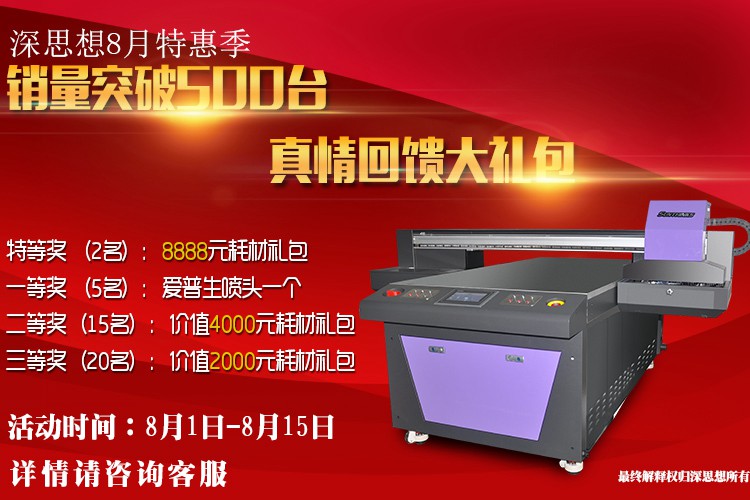 活動(dòng)日期:8月1日至8月15日 活動(dòng)獎(jiǎng)項(xiàng): 特等獎(jiǎng) (2名):8888元耗材大禮包 一等獎(jiǎng) (5名):愛(ài)普生噴頭一個(gè) 二等獎(jiǎng)(15名):價(jià)值4000元耗材禮包 三等獎(jiǎng)(20名):價(jià)值2000元耗材禮包 耗材禮包可以由客戶(hù)根據(jù)金額自由選配。 限時(shí)限量,名額有限!機(jī)會(huì)難得,預(yù)購(gòu)從速! 舉辦方:深圳市深思想科技有限公司 活動(dòng)地址:深圳市寶安區(qū)觀(guān)瀾高科園嘉泉大廈A棟 歡迎各位朋友上門(mén)考察! 本活動(dòng)最終解釋權(quán)歸深思想所有! |