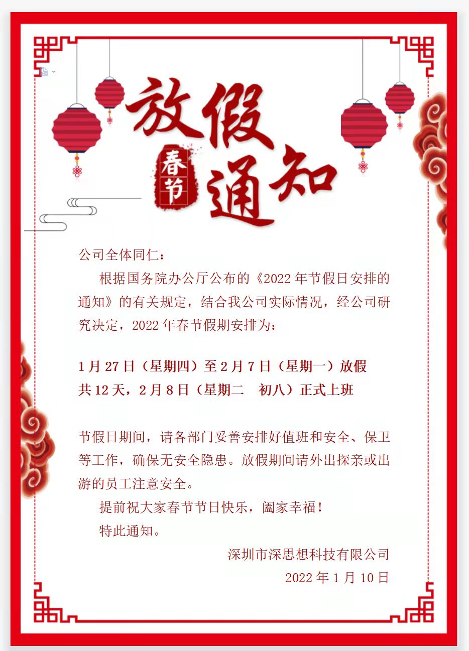 深思想工業(yè)數(shù)碼印刷機廠家2022春節(jié)放假通知