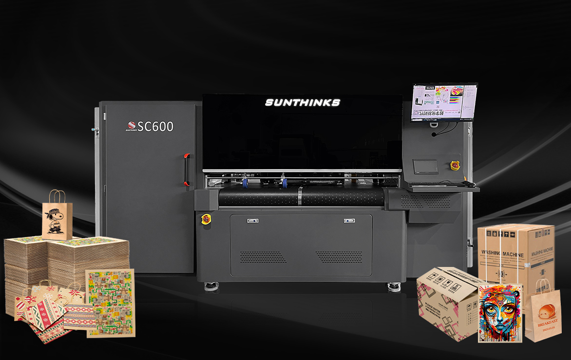 The Sunthinks SC600 digital single pass printer is a fast printing solution for direct printing onto packaging materials. Whether you're expanding your existing packaging business or starting a new one, Sunthinks offers a turnkey single-pass printing solution that delivers vibrant C/M/Y/K color results on demand. The SC600 can help you quickly start printing on porous packaging materials such as paper bags, pizza boxes, corrugated cardboard, corrugated cartons, and wood boards.